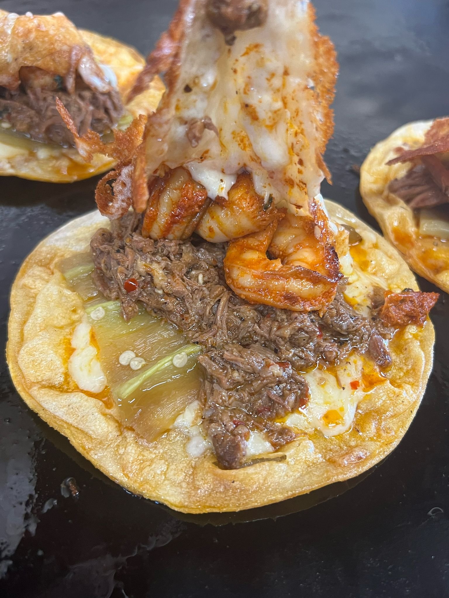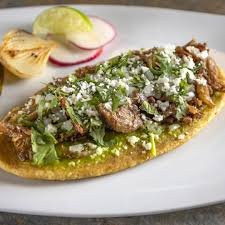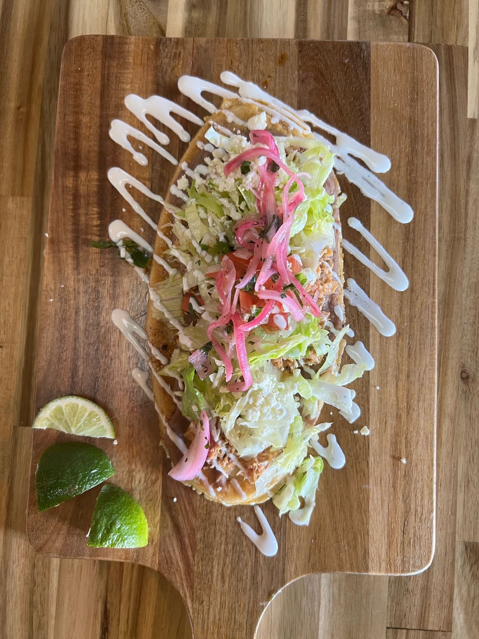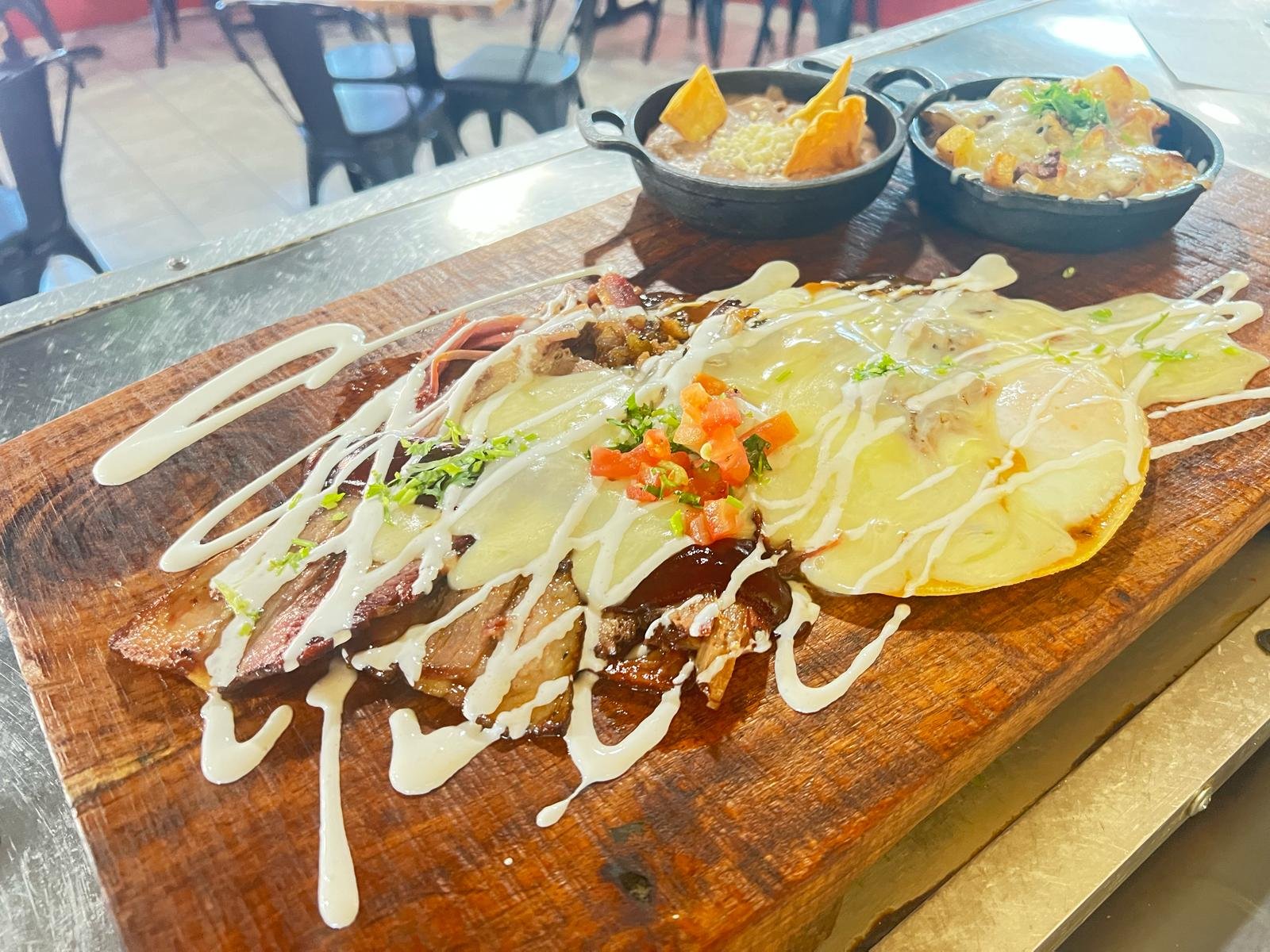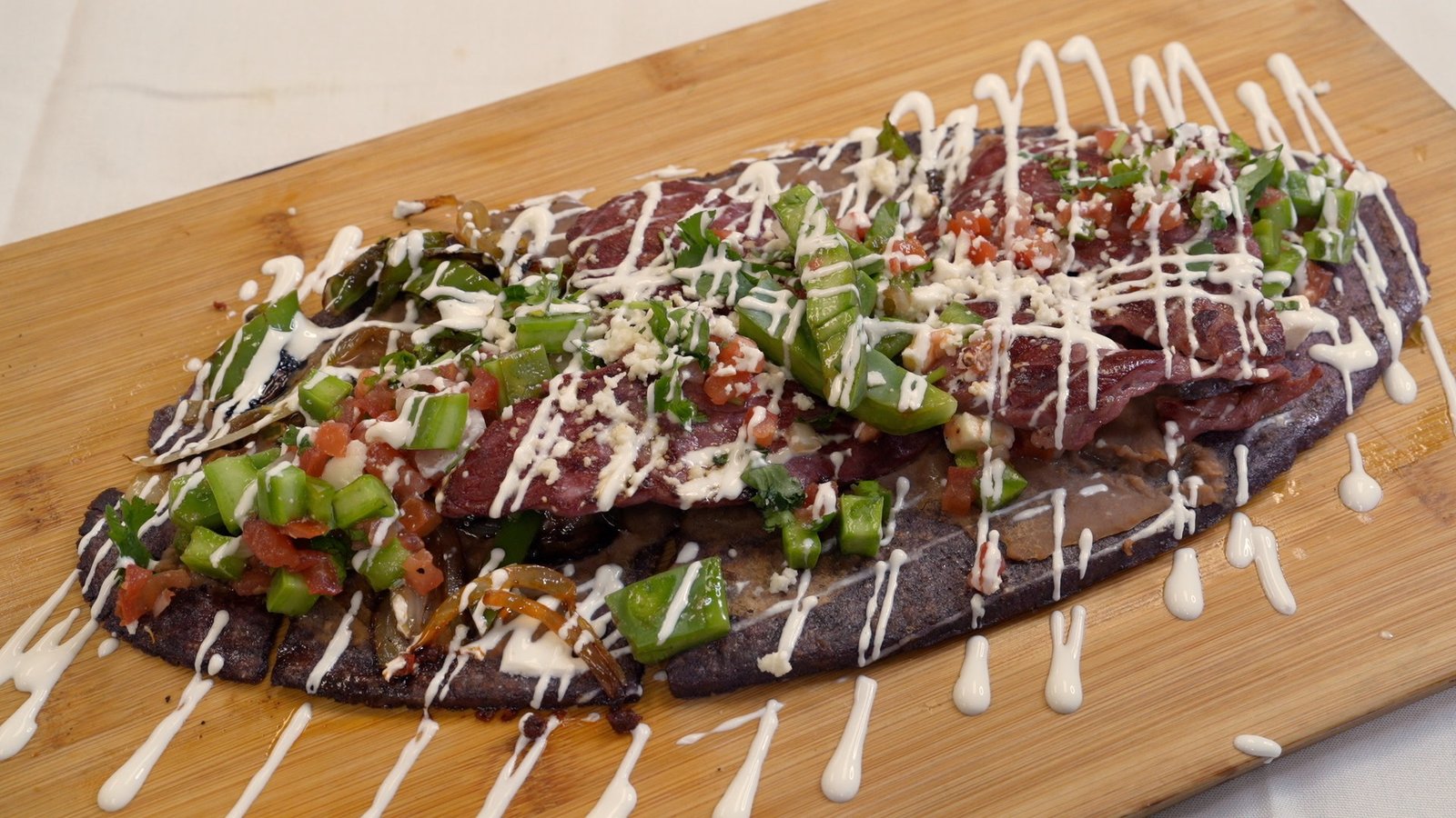 Blue masa stuffed with chorizo, oaxaca cheese served with grilled onions, peppers fried eggs, queso fresco, carne asada, pico de gallo, guacamole, mexican cream.