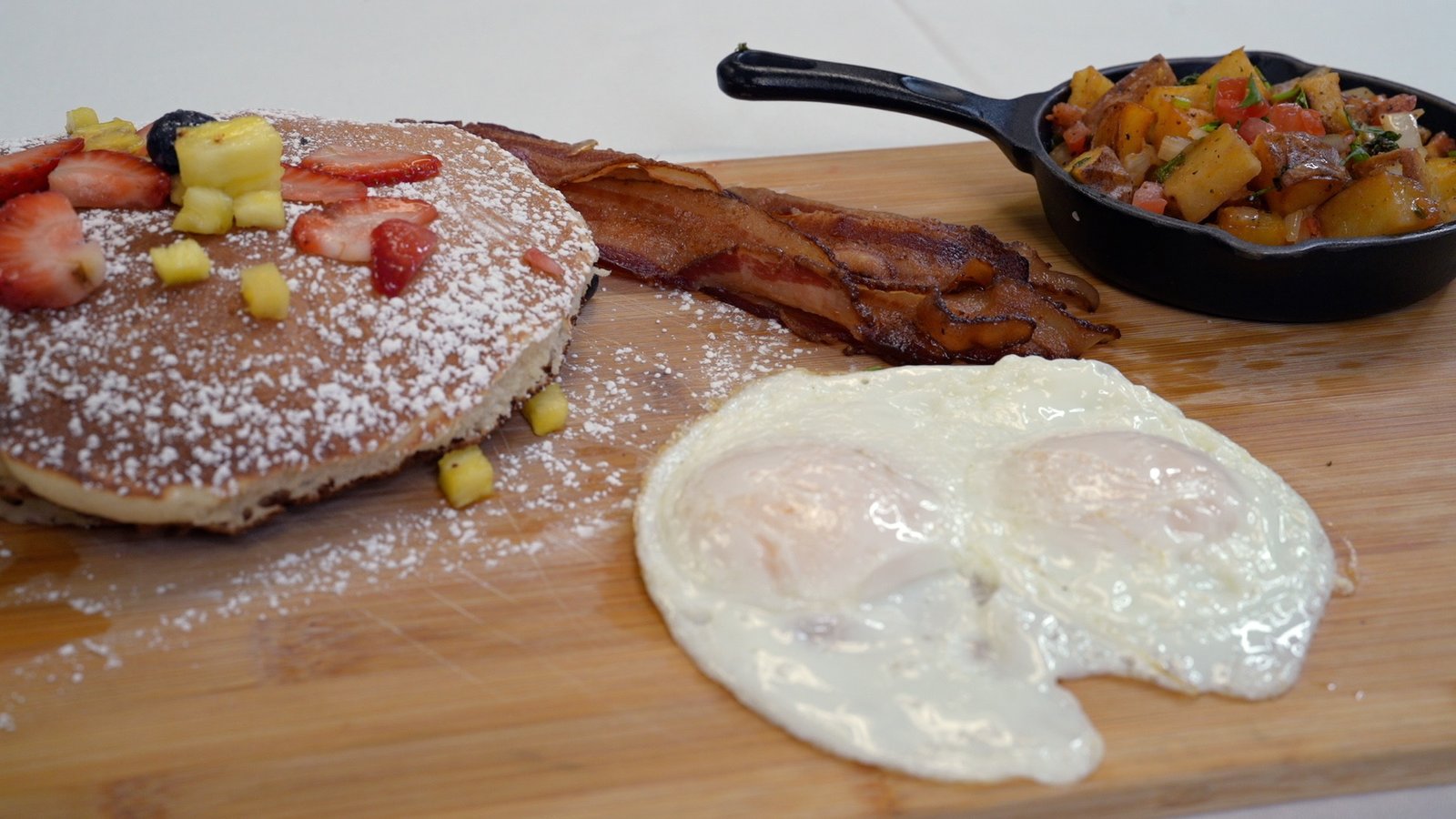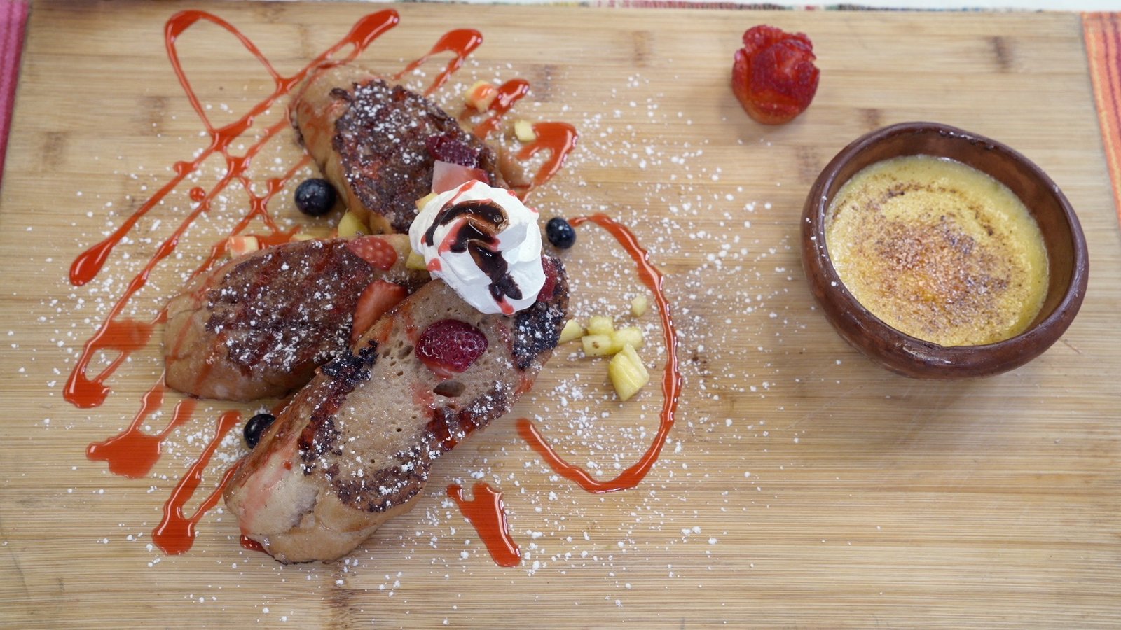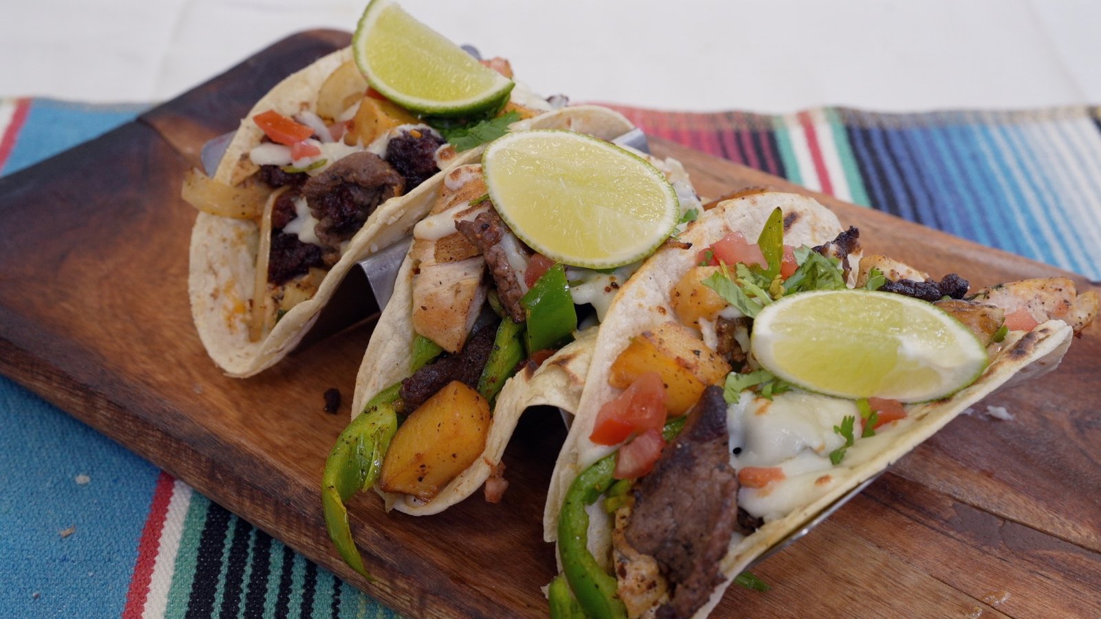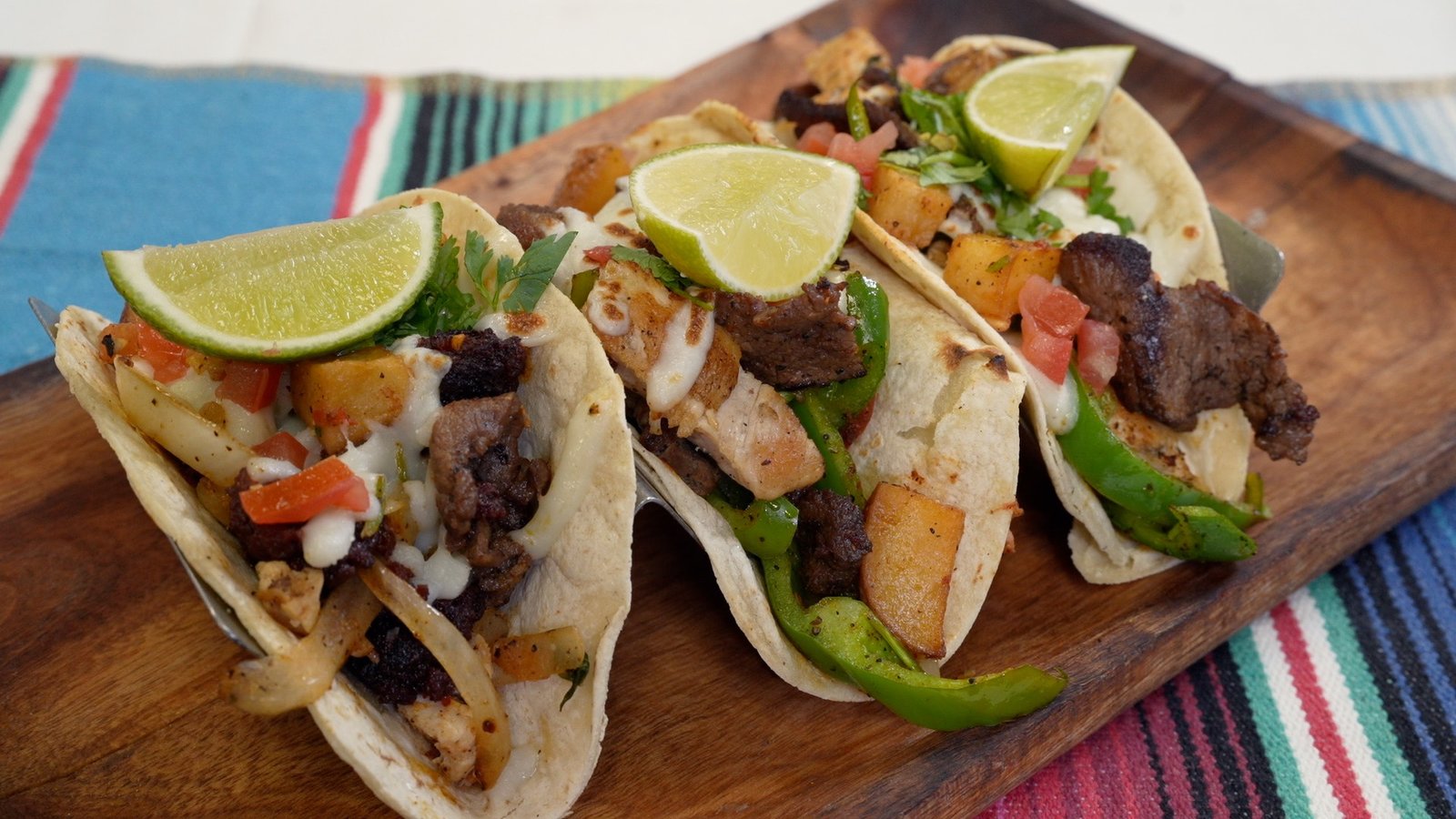 Blue masa stuffed with chorizo, oaxaca cheese served with grilled onions, peppers fried eggs, queso fresco, carne asada, pico de gallo, guacamole, mexican cream.