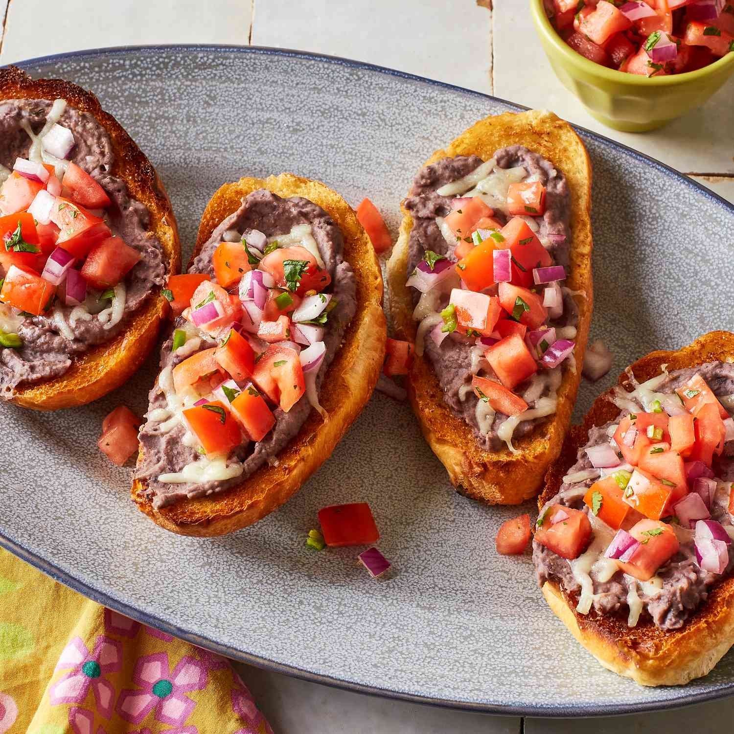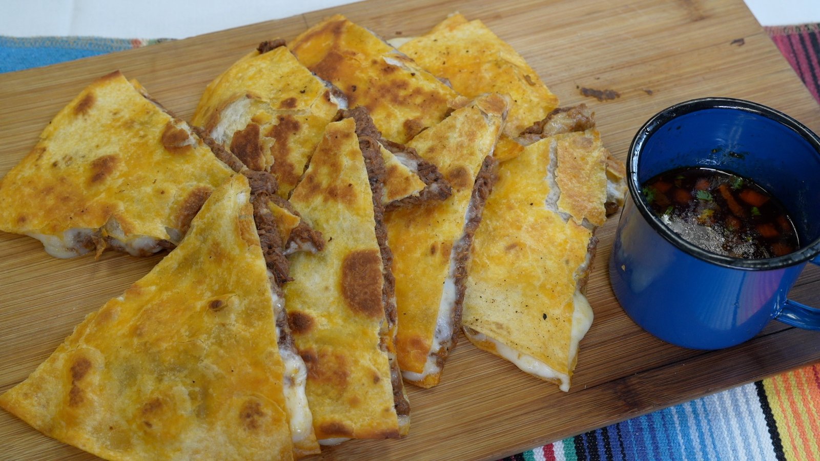 Stuffed with black beans, topped with tasajo (beef) with lettuce, tomatoes, onions, cilantro and queso fresco.