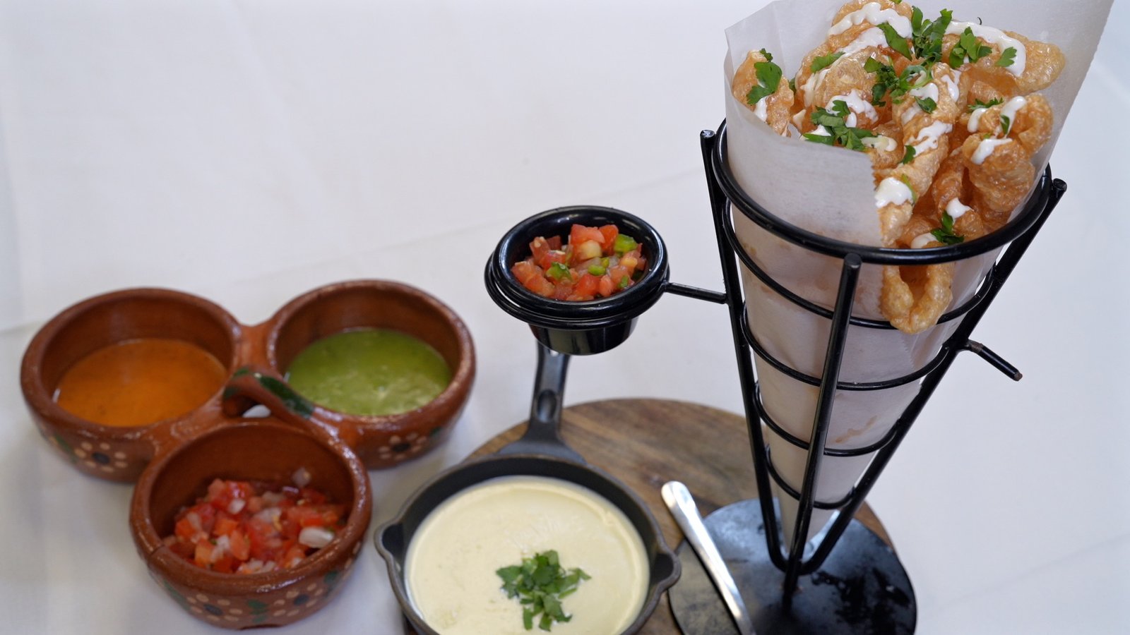 Crispy tortilla stuffed with chicken served with rice and beans topped with lettuce, queso fresco, tomatoes, cilantro and Mexican cream
