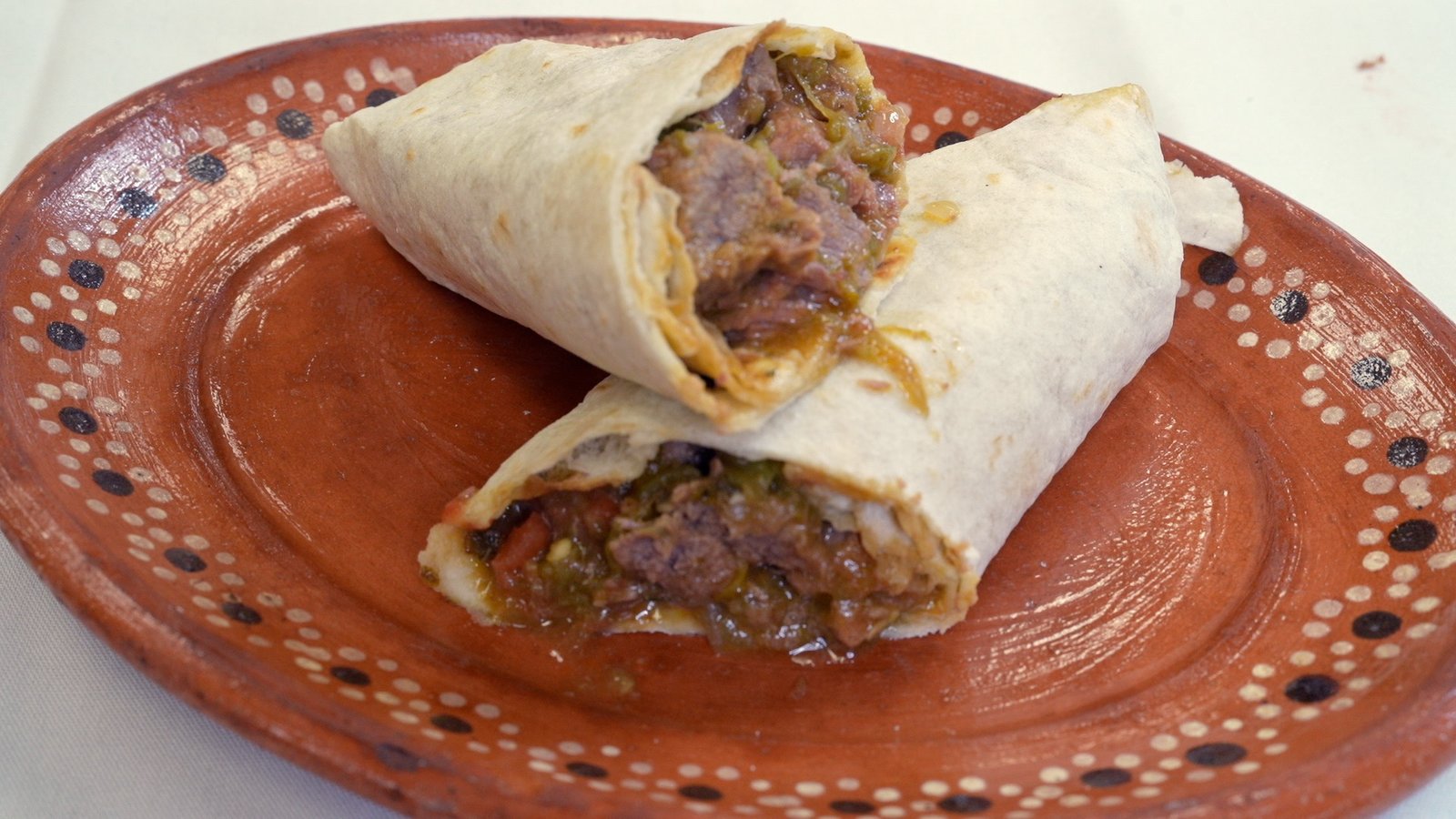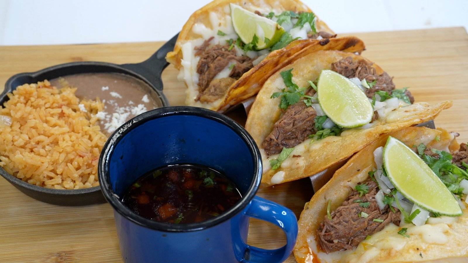 Crispy tortilla stuffed with shredded beef served with rice and beans topped with lettuce, queso fresco, tomatoes, cilantro and Mexican cream