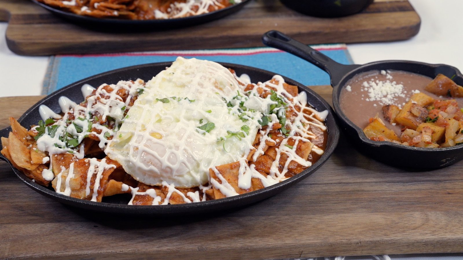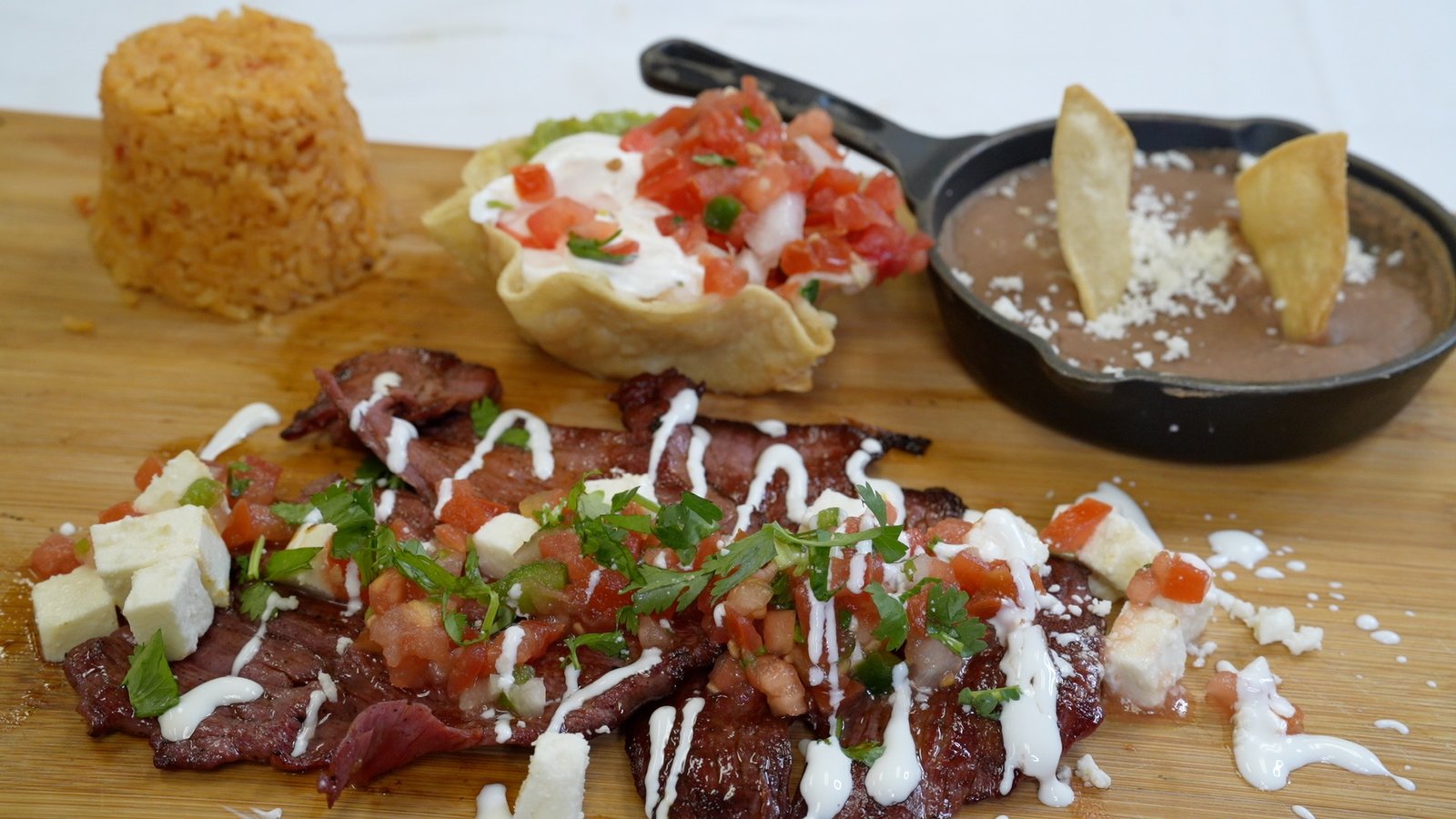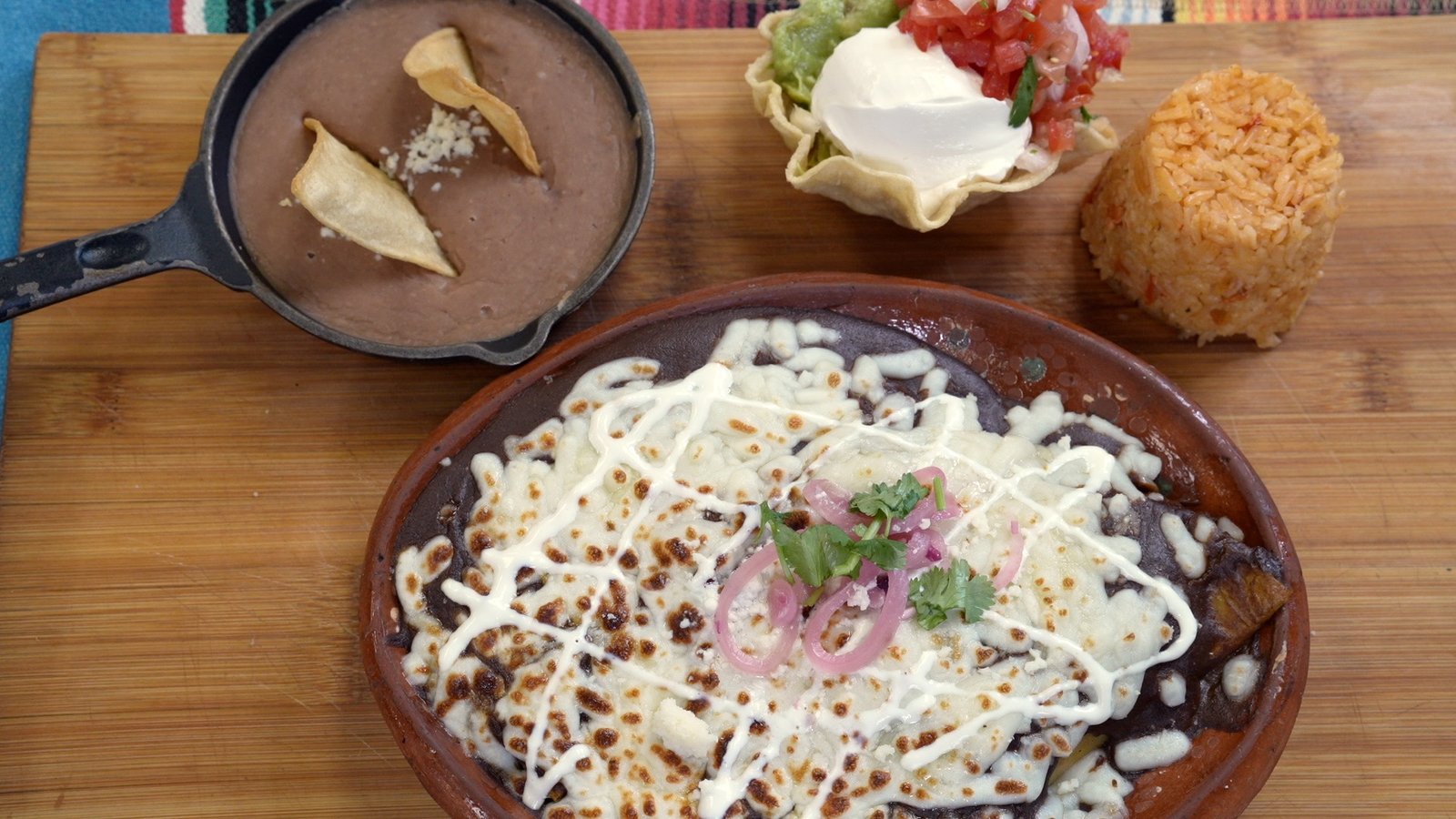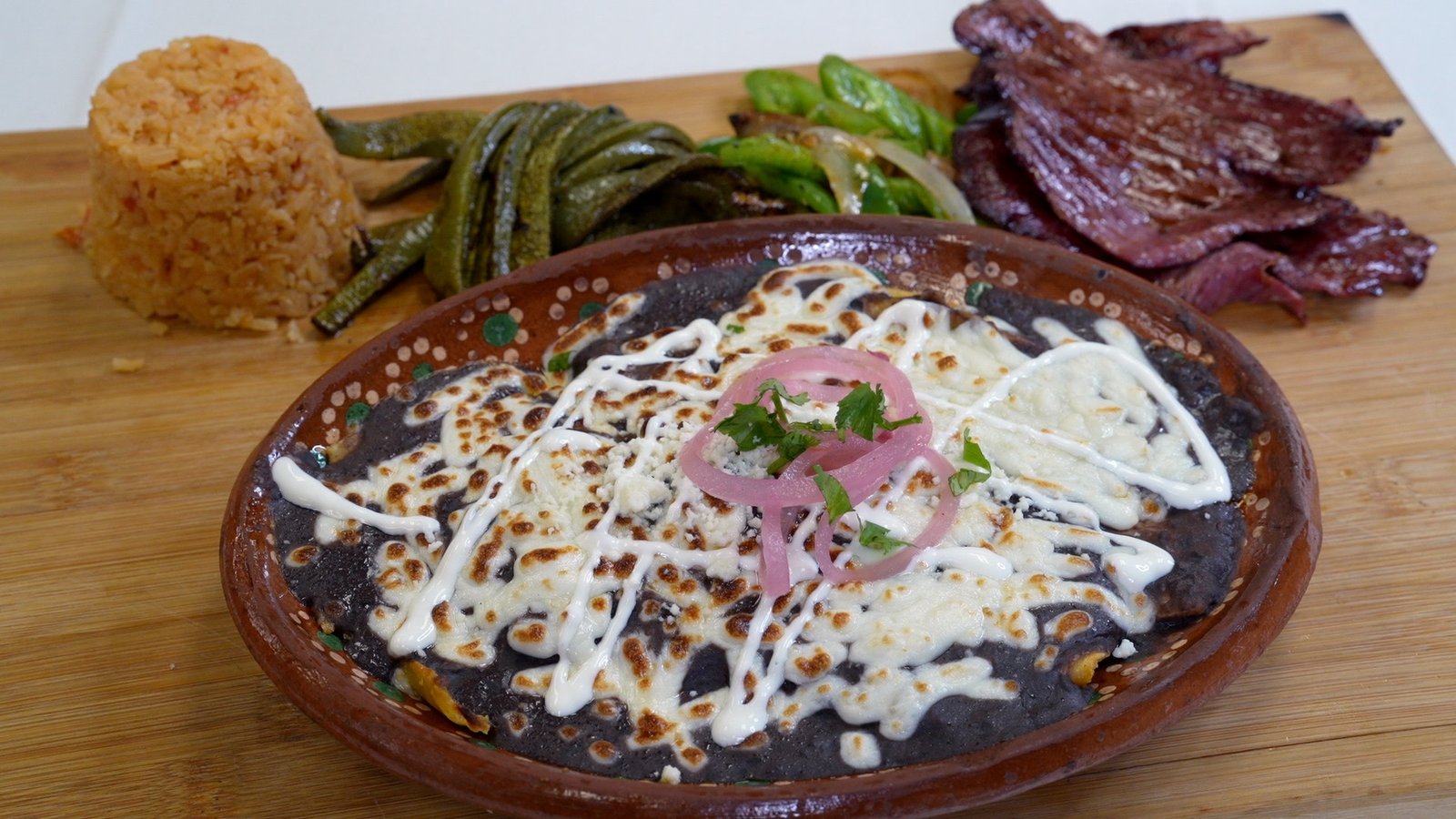 Corn tortilla dipped in a flavorful bean sauce, topped with queso fresco, cilantro, onions, Mexican cream, carne asada, grilled nopal served with rice and salad.